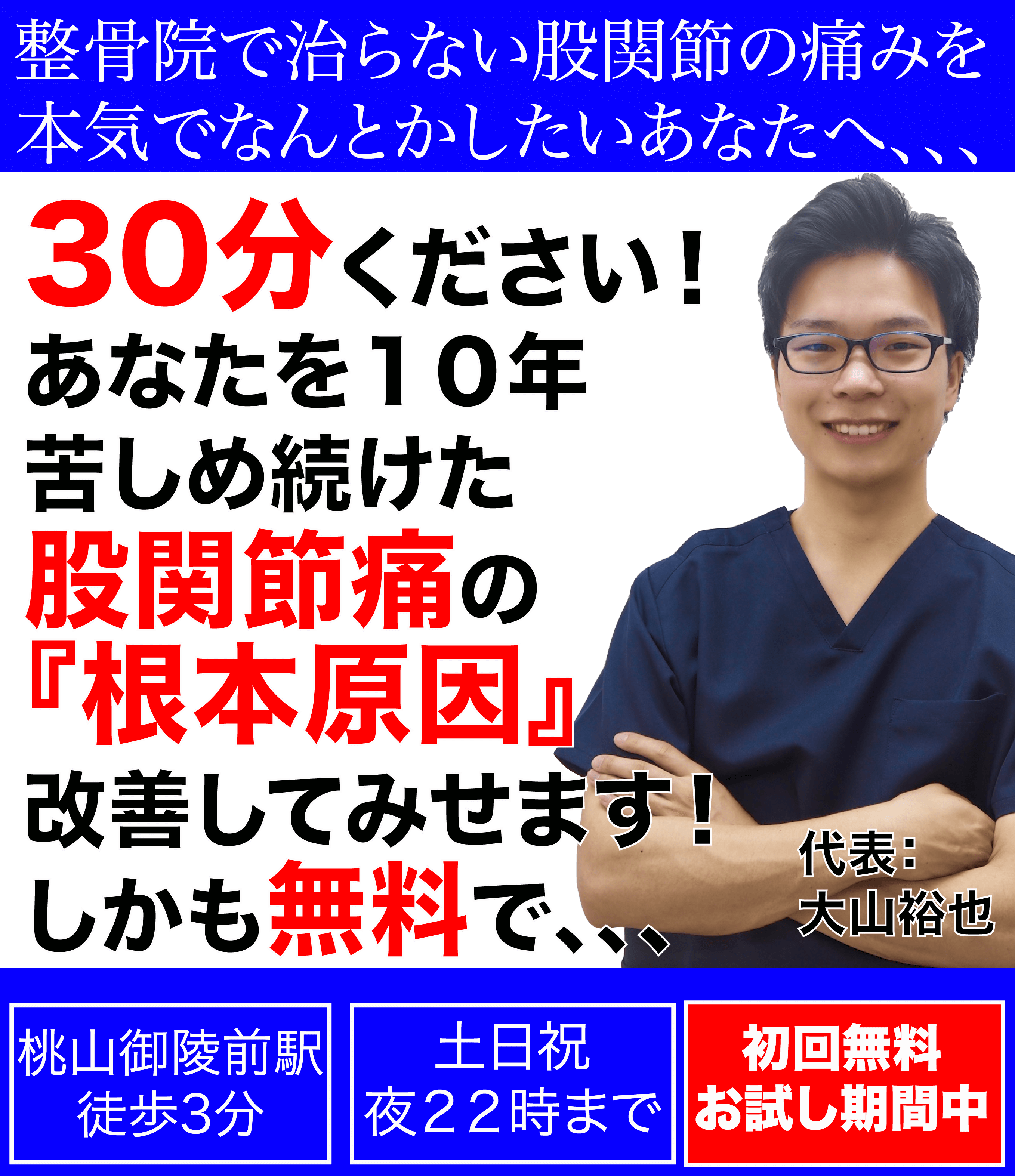 股関節の痛みでお困りのあなたは、一度整体院悠の大山先生を訪ねてみてください!後悔させません!