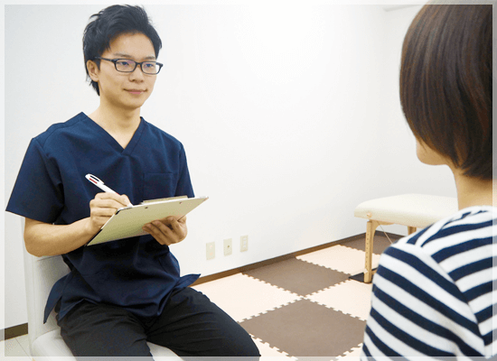 その後、お悩みの首の痛みについて「どこが・どのように・いつから痛むのか」などの内容を詳しく聞いていきます。ご不明な点や気になる点があればお気軽にご相談ください。