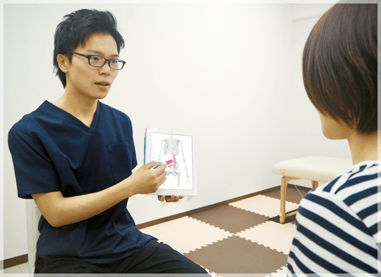 あなたの今の体の状態についてご説明していきます。体のバランスがどうなっているのか、それがどうして首の痛みを引き起こすのか、などを詳しく説明していきます。
